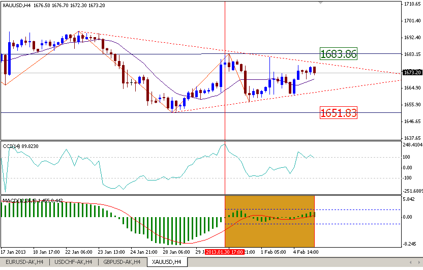 Dari Indikator MACD terpantau sejak perdagangan (30/01/2013) sampai perdagangan hari ini harga terlihat sideway, jika harga bergerak sideway ini suda berada di area overbought jika dilihat dari indikator CCI yang berada di atas angka 100%. dan jika harga dapat mendahului masing-masing harga yaitu area support di 1651 troy ounce dan resistancenya di 1683 troy ounce memungkinkan harga akan bergerak mengikuti trend itu yaitu naik/turun (lihat gambar).