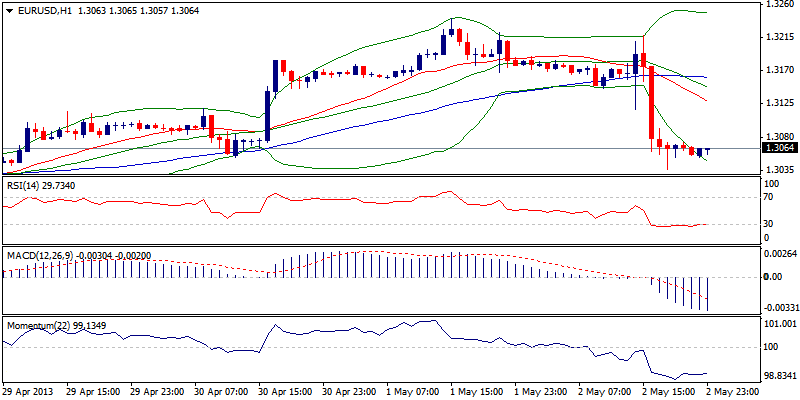 EUR/USD turun tajam di hari Kamis dan menguat mendekati reli 1.2950/1.3241 setelah percobaan di atas 1.3200 untuk memperpanjang kenaikan. Pola head and shoulder telah selesai dan terlihat adanya peningkatan resiko penurunan karena harga kehilangan level pentingnya di 1.2950 pada penurunan di bawah support 1.3100. Studi perjamnya berada di pola negative dengan indicator 4 jam nya yang bertahan di 1.3000. Reli koreksi apapun akan menemukan support yang bagus di 1.3100/20 dimana kenaikan seharusnya terjadi.
