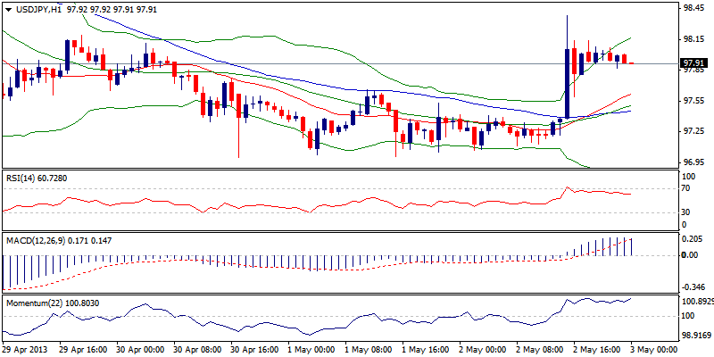 USD/JPY telah membuat dasar di 97.00 dimana beberapa percobaan utnuk turun sempat terjadi. Rebound di atas 98.00/25 terlihat sebagai potensi dari pemulihan yang lebih kuat seperti yang ditunjukkan oleh studi per jamnya yang berubah positif dan indicator per 4 jamnya yang menuju momen kenaikan. Fase konsolidasi seharusnya dapat berada di atas 98.00 untuk aksi kenaikan menuju 98.50. Namun break di bawah support 98.00 dapat membawa resiko penurunan terjadi.