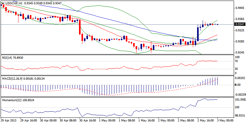 USD/CHF kembali naik setelah meninggalkan dasar jangka pendek di 0.9245 dan rebound mendekati resisten yang kuat di 94.97/92.45. Resiko penurunan awal bersifat sementara, indicator perjamnya berpindah di wilayah positif menunjukkan konsolidasi sebelum kenaikan lanjutan. Kegagalan untuk break lebih tinggi akan beresiko pelonggaran dengan support 0.9300 diperkirakan untuk bertahan dari pengembalian ke 0.9245.