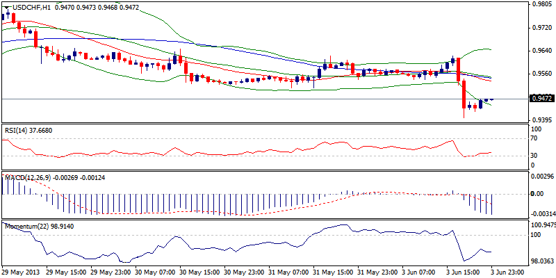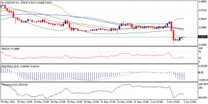 USD/CHF kembali menurun di hari Senin setelah mengulangi kegagalan untuk memperpanjang kenaikan di atas 0.9600 dan menjaga zona 0.9500. Penurunan di bawah support 0.9500, ditutup ke 0.9400 dan memperpanjang pelemahan dari 0.9836. Pola negative terjadi pada studi timeframe jangka pendek sementara indicator bergerak menuju ke bawah yang menjaga resiko penurunan pada fokus jangka pendek. Break di bawah 0.9400 daoat membuka 0.9360. Reli koreksi seharusnya terbatas di zona 0.9500/40.