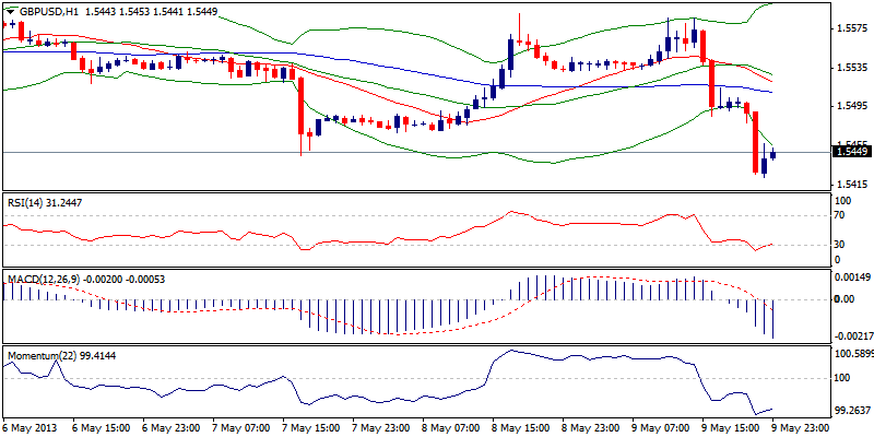 GBP/USD turun dan meninggalkan pla double top di 1.5590 ketika penurunan melalui support 1.550/1.5445 dan menuju zona 1.5400. Struktur jangka pendek negative menjaga penurunan dapat terjadi dengan break di bawah support 1.5410/00, terlihat konfirmasi dari area triple top di 1.5600. Target selanjutnya berada di 1.5350 dan 1.5300 sementara koreksi menemeukan resisten yang baik di 1.5500.