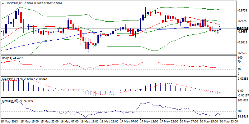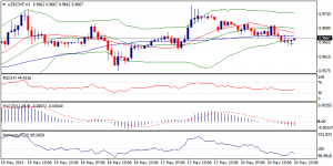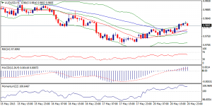 USD/CHF berada di bawah tekanan dengan perpanjangan dari pembalikan dari tertinggi di Jumat di 0.9759, menguji poin tengah dari kisaran jangan pendek dari 0.9576/0.9759. Struktur perjamnya lemah dan menjaga resiko penurunan terjadi. Namun, dips seharusnya berada di 0.9550 untuk menghindari koreksi yang lebih kuat dan menjaga kenaikan jangka pendek terjadi untuk melanjutkan tren naik seperti yang terlihat di pola positif pada studi 4 jamnya.