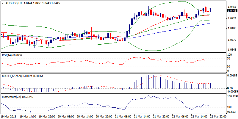 AUD/USD stabil di atas resistance psikologi 1.0400, dengan reli dibatasi di 1.0458, tertinggi dari 21 dan 22 Maret 2013. Secara kesuluran masih dalam area positif karena ditutup di atas 1.0400, dengan target berikutnya 1.0480 dan 1.0500 pada fokus jangka pendek. Pelemahan untuk koreksi kemungkinan akan berada pada support 1.0400, selagi tidak berlanjut di bawah 1.0340 yang merupakan batas bawah range.