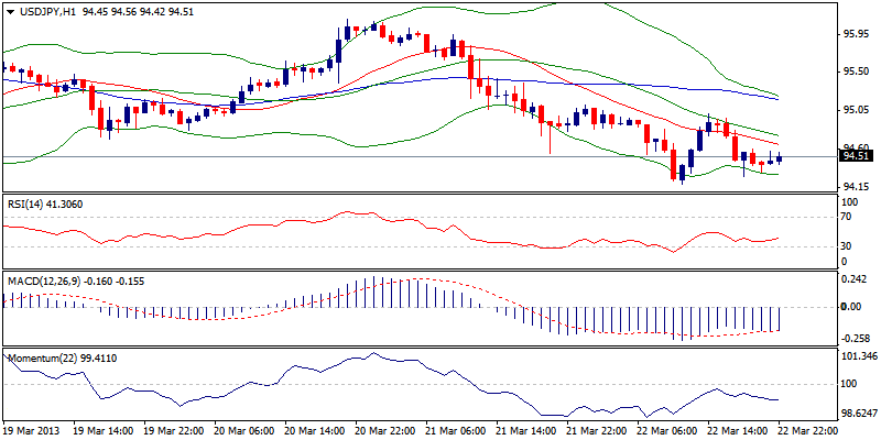 USD/JPY berada dalam tekanan, dengan low baru dalam mingguan di 94.18. Masih berada dalam area negatif dan beresiko untuk downside, reli retracement 38.2% dari 90.85/96.70 membuka jalan untuk fokus jangka pendek ke level psikologi 94.00 dan retracement 50% di 93.78. Area high Jumat lalu di 95.00, dengan MA 55 diharapkan batas pencobaan penguatan.