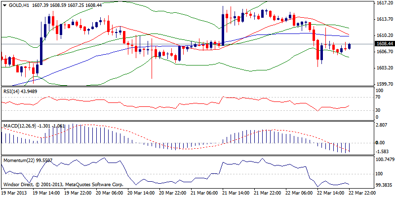 Gold melanjutkan trend positifnya dan bertahan di atas 1600. High baru-baru ini di 1620 dan retracement 50% dari 1684/1554, resistance kuat dan target jangka pendek. Pullback Jumat kemarin dan tutup di support 1600, akan tampak sebagai koreksi. Beberapa jam ke depan masih sideways, selagi indikator pada H4 berada dalam wilayah positif sehingga akan meneruskan penguatannya.