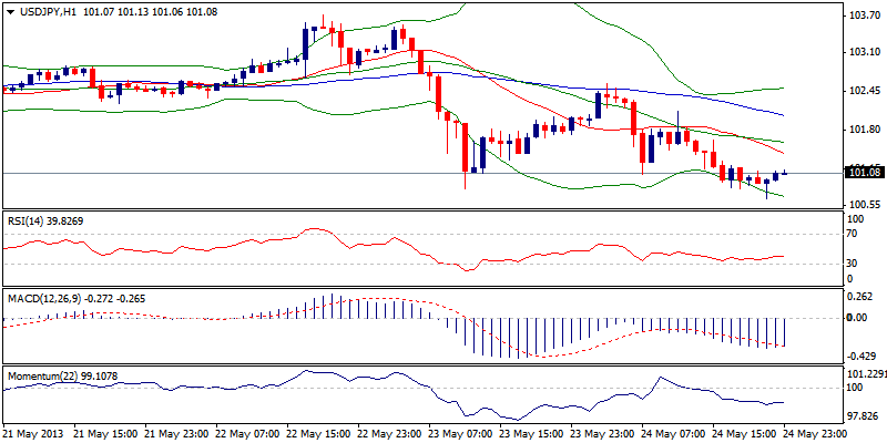 USD/JPY ditutup di wilayah merah, menunjukkan terendah dalam dua minggu di 100.65, menutup sesi perdagangan hari Jumat. Teknikal jangka pendek negative dan menangani resiko penurunan. Bearish dan tertinggi di hari Jumat di 102.57 menjaga kenaikan terbatas. Pelemahan lebih lanjut akan menemui support awal di 100.37, di bawah yang akan membuka jalan menuju level psikologis 100.00.