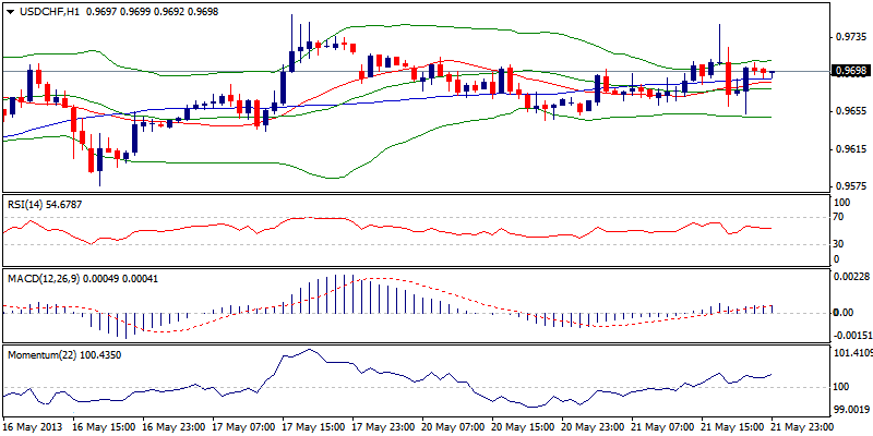 USD/CHF berada di pola neutral dengan sisi penurunan yang terlindungi do 0.9650 dan naik namun tidak dapat mencapai 0.9759. Konsolidasi lanjutan mungkin akan terjadi selama harga bertahan diantara batas-batas. Studi perjamnya netral dan bearish divergence terjadi di grafik 4 jamnya, menjaga resiko penurunan dari pembalikan yang lebih dalam menuju support Fibonacci 0.9600/0.9550. konfimasi membutuhkan break dibawah support awal 0.9650. BVreak di atas puncak konsolidasri jangka pendek dan tertinggi di 0.9759 dapat menandakan perpanjangan dari tren kenaikan dan mengekspos 0.9800.