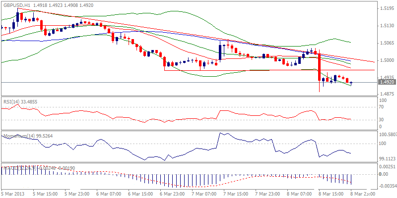 GBP/USD bergerak melewati level low baru-baru ini di 1.4963, juga kehilangan support psikologi/fibonacci di 1.4900. Close mingguan di bawah 1.5000, mengindikasikan pelemahan lebih lanjut downtrend yang lebih besar dari level 1.6380, dengan support menengah di 1.4853, retracement 61.8% dari 1.3501/1.7041 dan support signifikan yang lain di 1.4230, terendah sejak Mei 2010, diharapkan tetap fokus jangka pendek. Reli koreksi bergerak ke level 1.5000-1.5050.