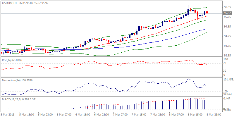 USD/JPY melanjutkan reli jangka menengahnya dengan melewati level 95.00 dan target berikutnya 96.00. Tidak ada halangan yang berarti menuju level psikologi 100.00, juga retracement 50% dari 124.14/75.55 pada jangka yang lebih panjang, akan tetapi sudah memasuki reversal pada area overbought di candle H4, harus diantisipasi. Resistance baru-baru ini di 94.55 dan 95.00, sekarang merupakan support yang bagus.