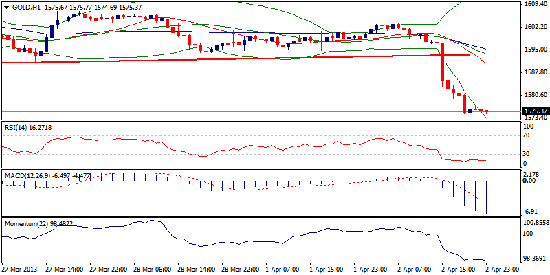 Emas sempat berada di bawah level segitiga pendukungnya dan menurun sepanjang range jangka pendeknya di 1590, hal ini dipicu oleh akselarasi penurunan. Sejauh ini mencapai 1574 yang berada di 76.4% Fibo retracement dari 1561/1616, hal ini terlihat penurunan yang lebih rentan. Studi jangka pendek berbalik negative. Namun kondisi chart per jamnya dapat memicu tindakan korektif singkat, namun belum ada sinyal kuat pembalikan yang terlihat. Tren negative dapat berlanjut sampai 1561, dengan kemungkinan akan meninjau kembali kunci dukungan jangka pendek di 1554,rendah dari 21/02 sementara sisi atasnya masih terbatas dibawah level psikologis 1600.