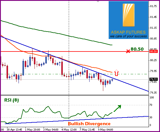 Dari skema diatas dan tulisan sebelumnya, Bullish divergence telah muncul bukan hanya di skala Daily tetapi juga di H4. Peluang USD/JPY untuk terangkat ke atas semakin besar. Trendline Bearish serta MA35 (berwarna oranye) kemungkinan bisa ditembus sebelum minggu ini berakhir. Rekomendasi BUY dengan target 80.50, dimana kemungkinan MA150 (warna hijau) akan melintas. Selamat Trading !