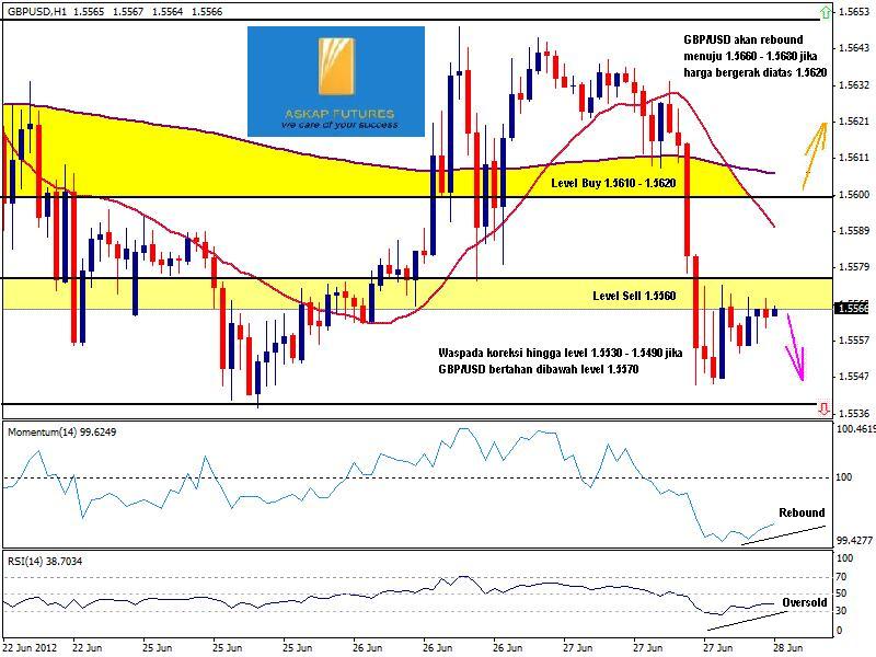 GBP/USD turun tepat sebelum sesi pembukaan AS dan ditekan tanpa suasana positif di kalangan investor AS, indeks Amerika naik tertinggi lebih baik dari perkiraan perumahan AS dan data barang lama. Pada chart hourly menunjukkan harga konsolidasi terakhir kalah, dengan harga bergerak jauh bawah MA, itu merupakan tren masih bearish dan indikator berubah datar di wilayah negatif. Dalam 4 jam grafik harga juga berada di bawah MA 100. Jika level 1,5535 dibreak maka selanjutnya akan memicu sebuah koreksi yang berkelanjutan dalam tren bearish. GBP/USD akan rebound jika dapat bertahan di atas 1.5620