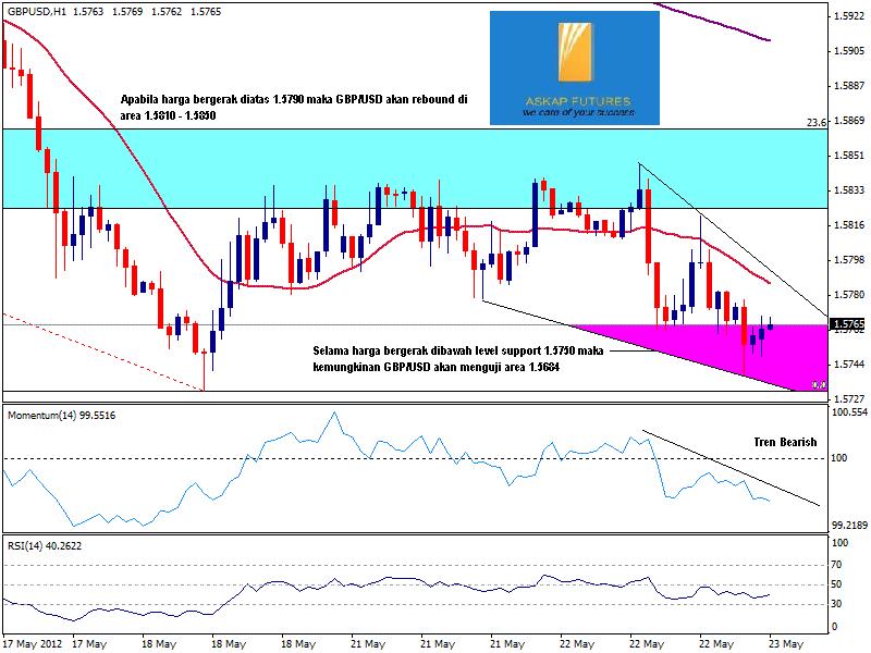 GBP/USD mendapat tekanan karena terkena angka lebih buruk dari yang diharapkan pada inflasi dan sektor perumahan, harga tidak mampu bertahan di atas 1.5800. Pada chart hourly menunjukkan harga di bawah garis MA yang dapat diambil keuntungan saat tren masih bearish. Dalam grafik 4 jam menunjukkan nada bearish terbatas, yang selanjutnya menargetkan kejatuhan hingga level 1,5660.
