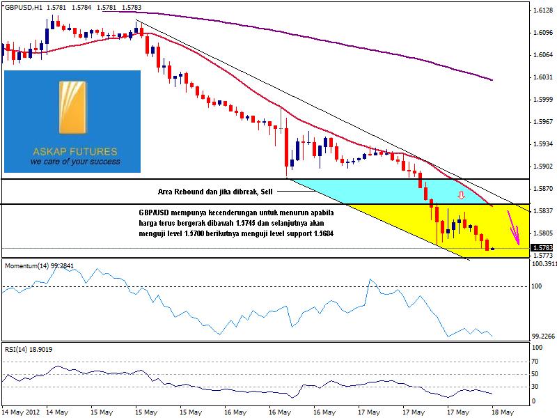 Dengan tidak banyak berita di Inggris, GBP/USD terus bergerak di bawah angka 1.5800. BOE nampaknya membuat rencana darurat jika terjadi Eropa break-up. Pada chart hourly menunjukkan tren bearish masih kuat, dengan indikator di tingkat oversold, jauh dari kesan uptren dalam jangka pendek. Support kunci terletak di area 1,5770, apabila harga terus bergerak dibawah level tersebut maka kemungkinan GBP/USD akan menuju area1,56.