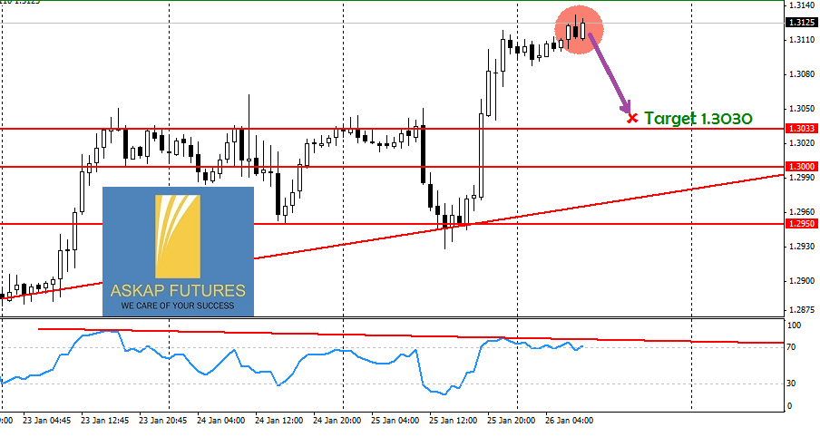 Time Frame H1 (gambar diatas) menunjukkan arah turun ke area 1.3060 bahkan bukan tidak mungkin ke 1.3030. RSI menunjukkan Bearish Divergence bahkan juga di H4, Candle satu jam yang lalu membentuk Shooting Star.