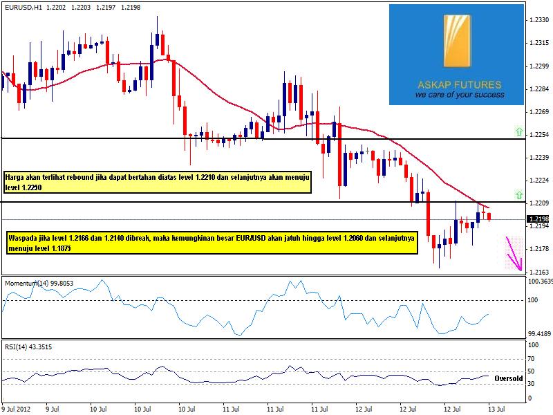 Sekali lagi mata uang umum itu jatuh terhadap sebagian besar rivalnya, mencapai 1,2166 terhadap dollar AS. Bouncing Akhir didorong oleh indeks AS, sejauh ini masih ditutup di bawah 1,2210 dan chart hourly menunjukkan harga bergerak menuju MA yang terlihat akan rebound terbatas, sedangkan indikator datar di wilayah negatif. EUR/USD membuat pesimis di kalangan investor atas pertumbuhan global yang sangat lambat. Angka PDB Cina akan memainkan peran besar dalam nasib mata uang, sebagai tanda-tanda lebih lanjut dari kemerosotan ekonomi akan menyebabkan dolar mengalami kerugian dari yielders yang tinggi. Dalam grafik 4 jam indikator terlihat jenuh yang berada dalam tingkat oversold, meskipun terlihat tidak ada minat beli. Harapan untuk rebound ada ketika harga bisa kembali area 1.2250. Sebaliknya, ketika harga jatuh dan bergerak di bawah 1,2140 maka kemungkinan EUR/USD akan jatuh ke daerah 1,1870 (Terrendah Juni 2010) dalam tren bearish saat ini.