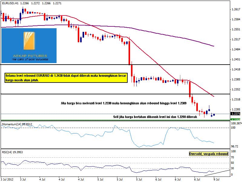 Dolar dibuka gapping lebih tinggi terhadap sebagian besar rivalnya. EUR/USD turun jauh dan membuat level terrendah tahunan setelah data tenaga kerja AS, di atas bulan sebelumnya namun di bawah ekspektasi. Dengan bank sentral memangkas suku bunga dan tidak ada QE pada pandangan AS dan EUR/USD kemungkinan akan tetap di bawah tekanan minggu ini. Chart hourly menunjukkan indikator di wilayah oversold ekstrim, jauh dari menunjuk untuk koreksi dengan harga bergerak di bawah 1,2290, sementara MA masih mengarah kebawah. Dalam 4 jam juga menunjukkan koreksi sedangkan indikator teknis jatuh jauh di dalam wilayah oversold, Jika harga tetap bertahan dibawah 1.2290 maka kemungkinan EUR/USD akan jatuh ke level 1.2150 tetapi apabila rebound maka harga akan menuju level 1.2389.