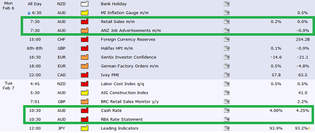 Hari Senin, 6 Februari 2012, data retail sales bulanan Australia akan dirilis. Prediksinya memang baik, tetapi perhatikan dengan rencana penurunan suku bunga dari Bank Sentral Australia (RBA) pada hari selasa, 7 Februari 2012, sebanyak 25 basis poin. Berita fundamental hari selasa tersebut yang akan menjadi ajang ketok palu apakah AUD akan benar-benar anjlok atau tidak.