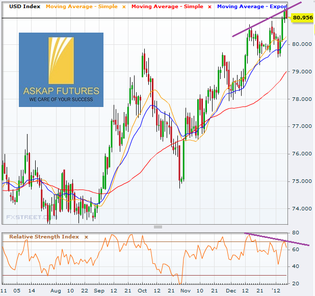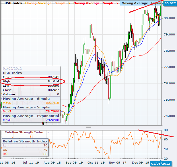 Data Non-Farm Payroll menembus angka 200 ribu, level ideal untuk proses pemulihan ekonomi Amerika. Index Dolar sempat ke level 81.xx dan pada senin kemarin 9 Januari 2012, Dolar Amerika melemah. Pola Bearish Divergence kembali terulang, bahkan semakin kuat. Lihat gambar berikut !