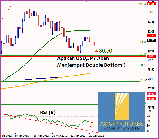 Lupakan sejenak harga emas yang terus tertekan. Mata uang Yen masih menjadi tarik ulur, disatu sisi dijual oleh Bank Sentral Jepang, di sisi yang lain tetap diburu sebagai safe haven. Candle Daily Jumat lalu memberi sinyal turun (Shooting Star). Secara Teknikal konfigurasi ‘Double Bottom’ bisa terjadi di USD/JPY, Lihat gambar berikut !