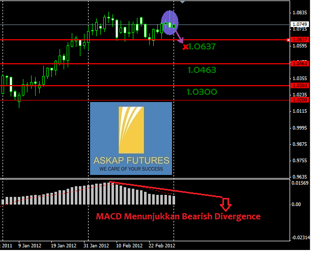 Secara Teknikal Dolar Australia akan mengalami koreksi. Candle Daily membentuk Shooting Star, MACD memberi sinyal harian Bearish Divergence, lalu kemana target pergerakan harga ? Level Support yang paling dekat di 1.0637, dibawahnya ada 1.0463, bahkan 1.0300 bisa saja disentuh dalam beberapa hari kedepan.