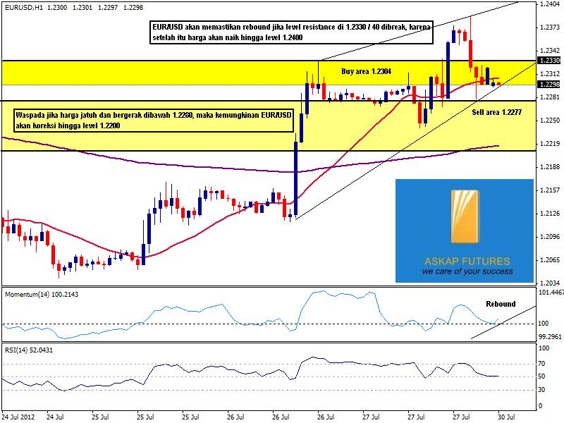 Perkembangan minggu terakhir, ECB akan mempersiapkan semua artileri sebagai otoritas Uni Eropa karena pernyataan oleh Presiden ECB’S kemarin yang akan melakukan “apa pun untuk menyelamatkan euro”, kata-kata tersebut dibutuhkan saat ini dan harus didukung dengan fakta. Bagaimanapun Investor, tetap berhati-hati dalam mengambil keuntungan dari pergerakan EUR/USD yang minggu lalu mencapai 1,2389. Pada sesi pembukaan EUR/USD berada dilevel 1,2300, chart hourly menunjukkan indikator berada di wilayah netral dan bergerak sedikit di bawah MA sehingga kehilangan momentum untuk naik. Dalam grafik 4 jam, indikator menuju ke bawah dari level overbought tetapi masih di wilayah positif. Perhatikan apabila harga sudah bergerak di bawah 1,2280 karena kemungkinan EUR/USD akan koreksi hingga 1.2200, dan harga akan kembali rebound hanya sampai batasan resistance di level 1,2340.