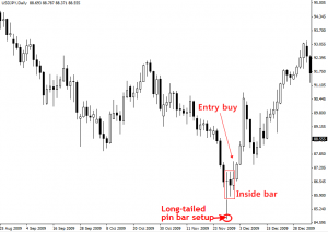 Yang kedua, signal reversal yang valid bisa anda lihat hanya melalui sumbu / ekor panjang dari pin bar tanpa harus melihat faktor pendukung  support ataupun resistance. Anda hanya perlu melihat konfirmasi price action setup yang terbentuk pada hari berikutnya. Seperti pada grafik USDJPY dibawah ini. Dimana pin bar dengan sumbu terpanjang belum membentuk kosilidasi market yang tuntas. Dihari hari berikutnya baru terlihat level tertinggi inside bar telah terlampaui oleh formasi candlestick disampingnya, yang mengisyaratkan harga akan cendrung bergerak naik. Anda bisa melakukan entry setelah formasi bar tersebut selesai terbentuk.