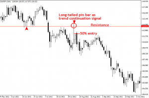 Jika pada hari berikutnya harga tidak bergerak melebihi 50% level retracement sumbu pin bar, kita bisa mengasumsikannya sebagai sebuah sinyal trading yang valid untuk melakukan entry.