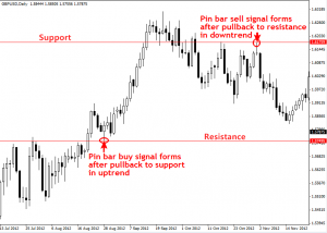 Dalam ini kita akan melihat formasi pin bar yang menunjukan trend yang kuat setelah terjadinya pullback dari level-level support atau resistance.